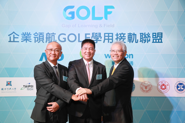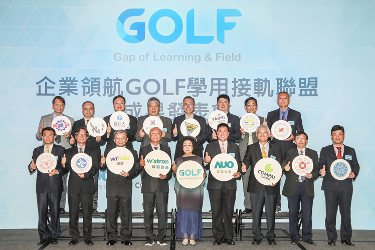 GOLF integrates the power of industry and schools to create an innovative collaboration platform centering “education-field match & bridging industry-academia” (Front row, left to right: (Chii-Dong Ho, TKU Vice President; Chi-Ruei Lin, YZU President; Charles Hsu, Wistron CEO; Robert Huang, Wistron GM & CEO; Fan Sun-Lu, Deputy Minister of Education; Paul Peng, AUO Chairman & CEO; Martin Wong, Compal GM & CEO; Ming-Guo Ho, TTU President; Herchang Ay, SJU President; Back row, from left to right: Chi-Ruei Lin, MSTU President; Tzu-Hsiang Ko, LHU President; Ching-Jong Liao, TTU President; Jen Jen-Fon, NCHU Vice President; Jing-Yang Jou, NCU President; Yi-Jun Jen, NTUT Vice President; Shih Ta-Ming, CUST Vice President; Thu-Hua Liu, MCUT President)