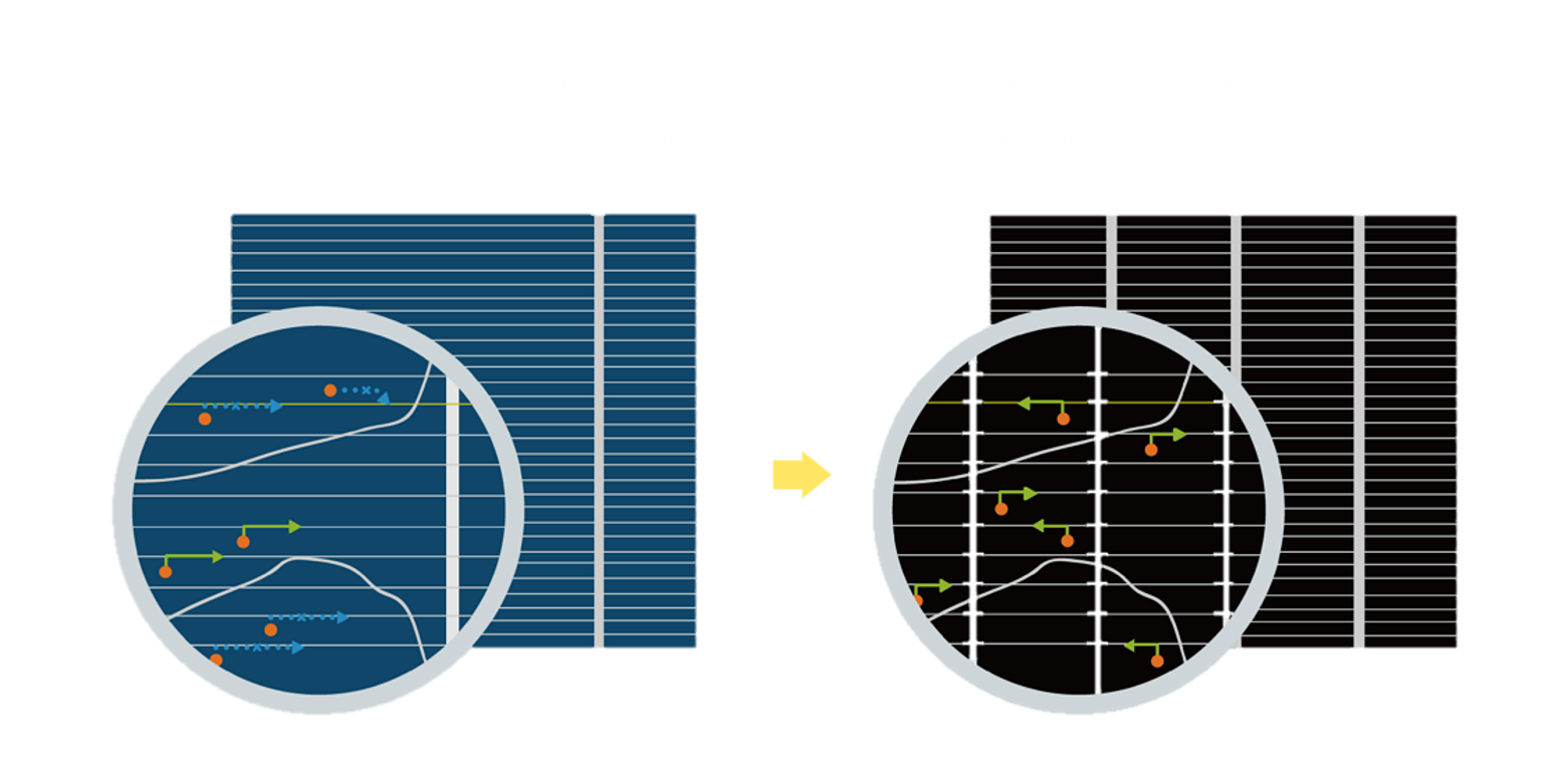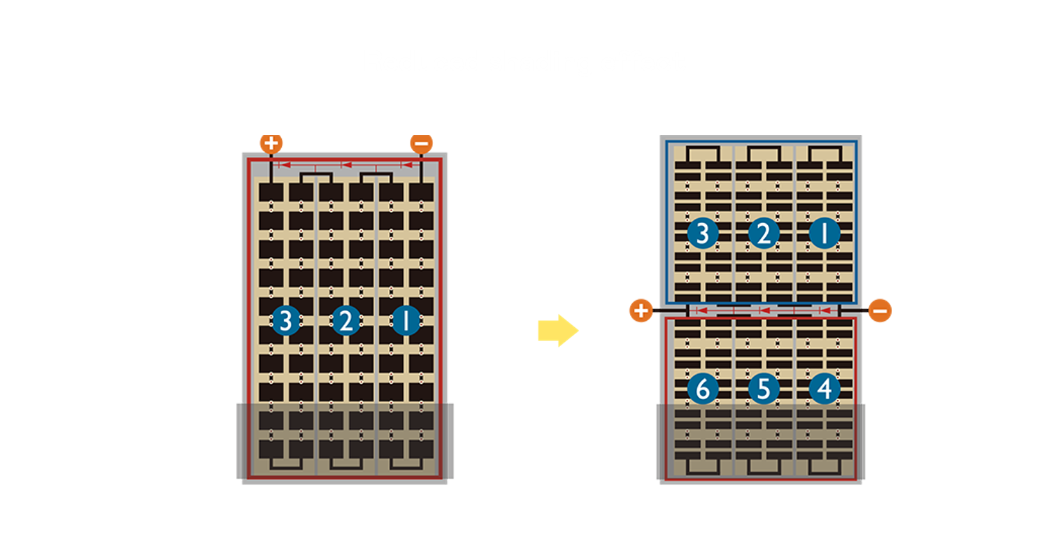• 結(jié)合半切電池,降低遮陰影響、提升模組抗隱裂能力、并減少電阻損耗,進(jìn)一步提升模組發(fā)電效能。