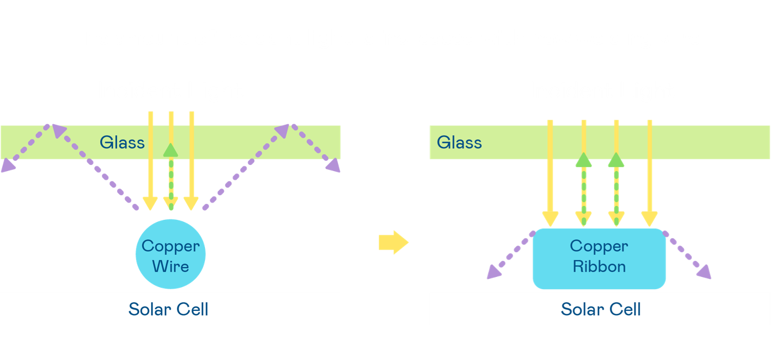 • 電池使用多條銅導(dǎo)線 (Copper wire) 于電池片上形成較短的電流路徑,提高電流收集效率,采用圓形設(shè)計(jì)的銅導(dǎo)線較傳統(tǒng)扁平式的銅焊帶 (Ribbon),可增加入射至電池的光線量。