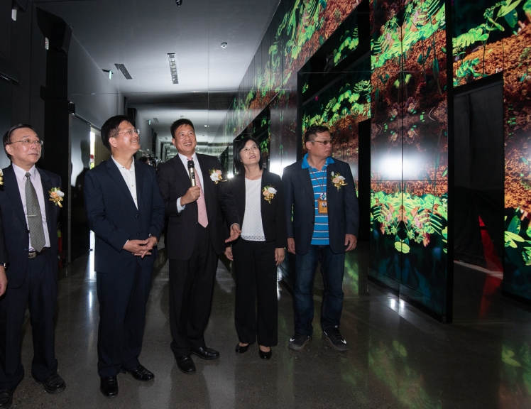友達微美館以大自然實景拍攝結合電腦動畫的壯闊影片,讓觀眾仿佛身歷其境感受植物的生命旅程 (左一:國立臺灣博物館館長洪世佑、左二:臺中市市長林佳龍、左三:友達光電董事長暨執行長彭雙浪)